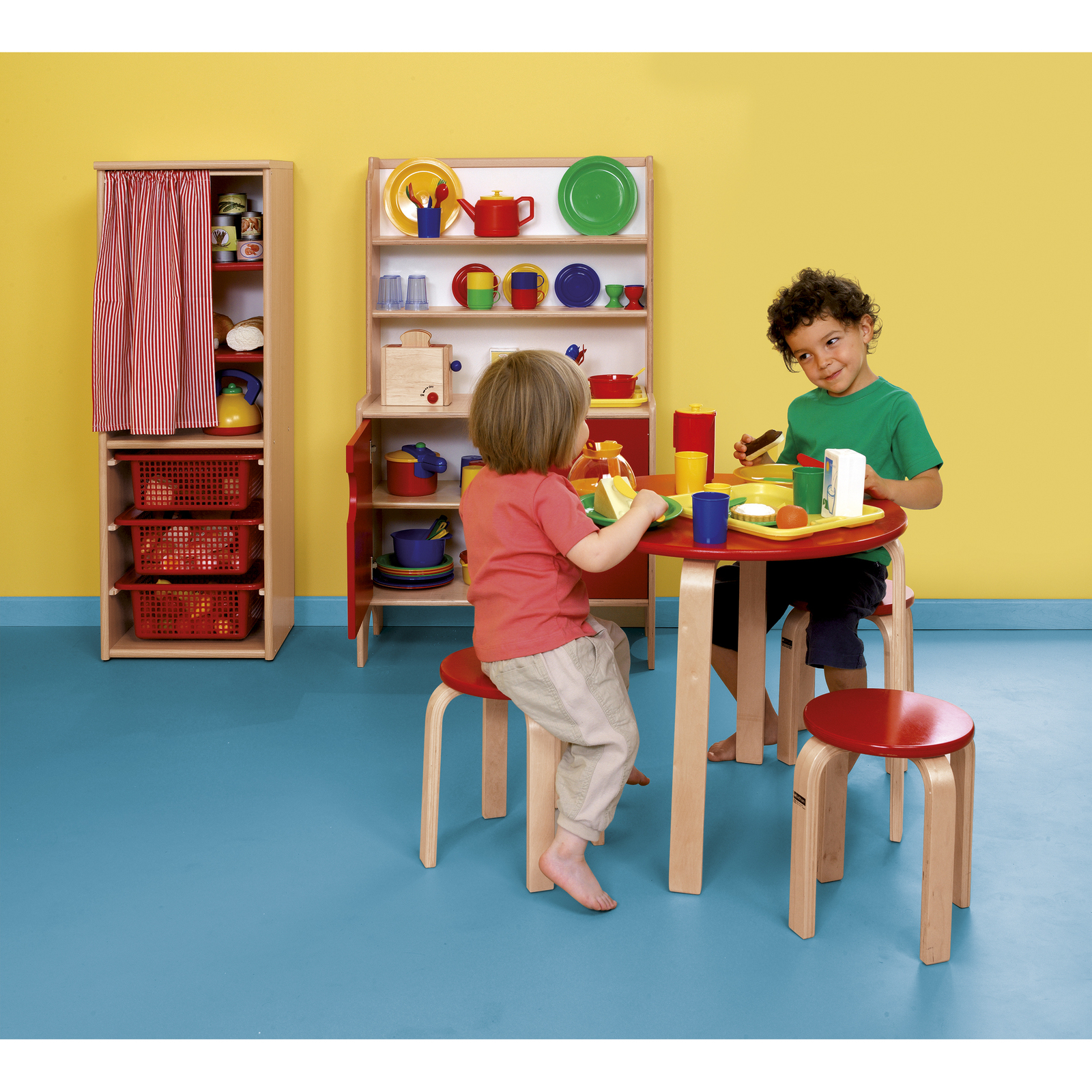 Meuble de rangement pour la vaisselle : 2 étagères en contreplaqué verni en haut et 1 grande étagère centrale en bas.Meuble de rangement pour la vaisselle : 2 étagères en contreplaqué verni en haut et 1 grande étagère centrale en bas. Les 2 portes laquées en rouge s'ouvrent par des encoches pour éviter de se pincer les doigts.• En bois contreplaqué verni.
