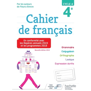 CAHIER DE FRANCAIS CYCLE 4 / 4E - ED. 2019 - Collection : FLEURS D'ENCRE - Auteur(s) : BERTAGNA CHANTAL