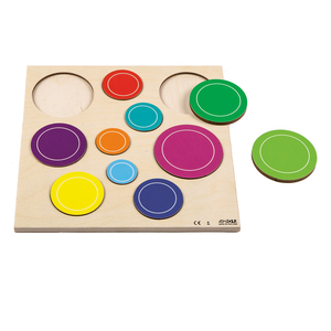 Puzzle en relief. Pour découvrir et trier les différentes tailles de ces bulles colorées! Contenu : 10 pièces et 1 support en bois - Dim. (L x l) : 24,5 x 24,5 cm