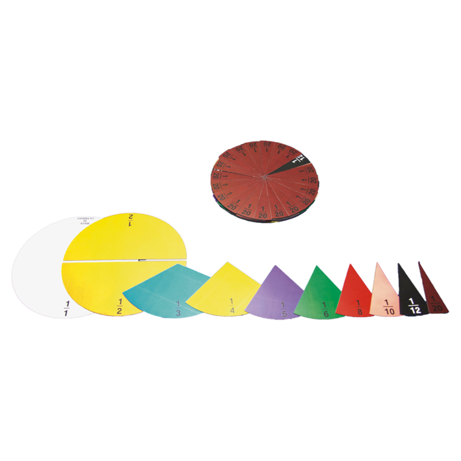 Idéal pour l’enseignant et la démonstration au tableau. Set de 10 fractions magnétiques de 1 à 1/20e en plastique souple et pièces magnétiques au dos. Marquage et couleur facilitent le repérage des fractions. Livré en boîte carton.Contenu : 71 pièces - Dim. (Ø) : 26 cm