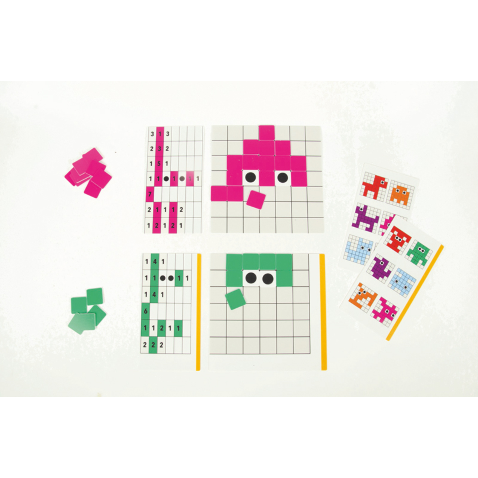 Ce jeu est basé sur le principe du code binaire. Ce code attribue un modèle de chiffres binaire à chaque caractère. Et se faisant pixel par pixel apparaitra une image ! Contenu : 2 plateaux de 49 pixels, 2 plateaux de 36 pixels, 120 pixels colorés + 8 pixels avec des yeux, 8 cartes d'exercices, 2 cartes avec les solutions et les règles du jeu