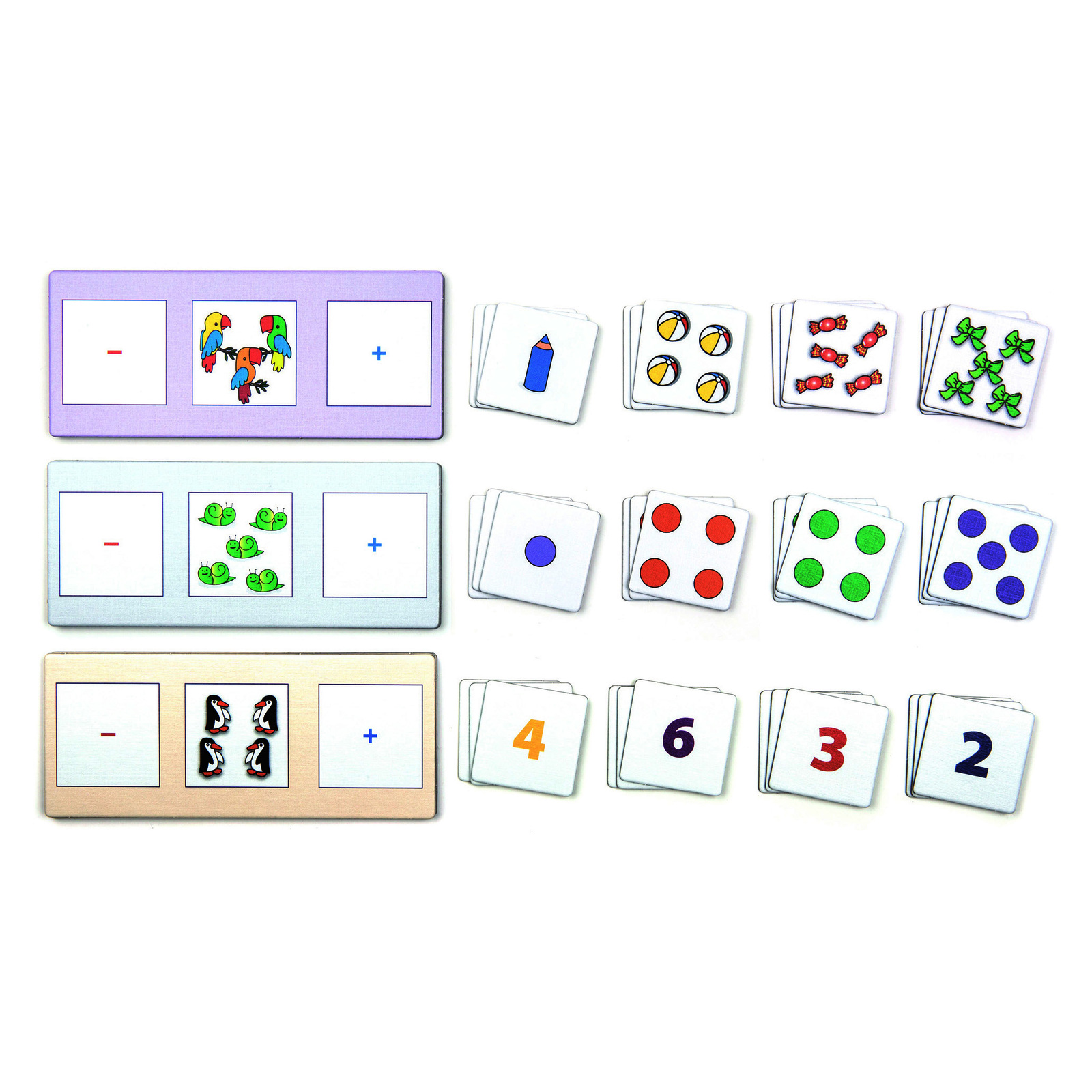Pour travailler sur les compétences en mathématiques avec des enfants d’âge préscolaire. C’est en répétant tout en enlevant ou en ajoutant un objet que l’enfant va réaliser en visualisant ce que veut dire un de plus ou un de moins.Contenu : 36 petites cartes, 12 grandes cartes instruction et 1 manuel