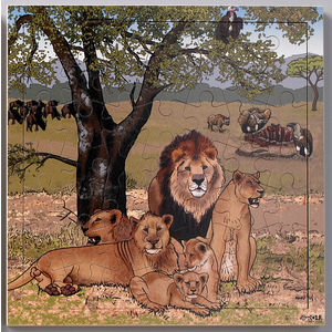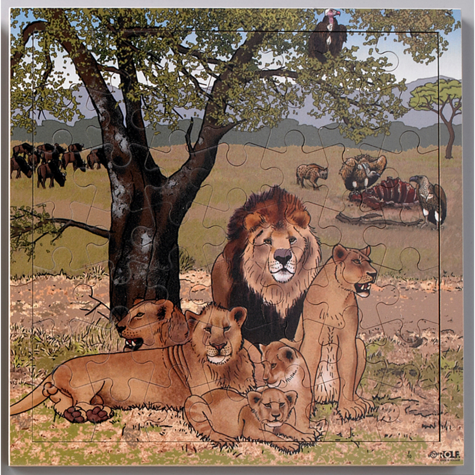 Pour composer le paysage des lions dans la savanne.Contenu : 36 pièces et 1 cadre en bois - Dim. du puzzle (L x l) : 28 x 28 cm