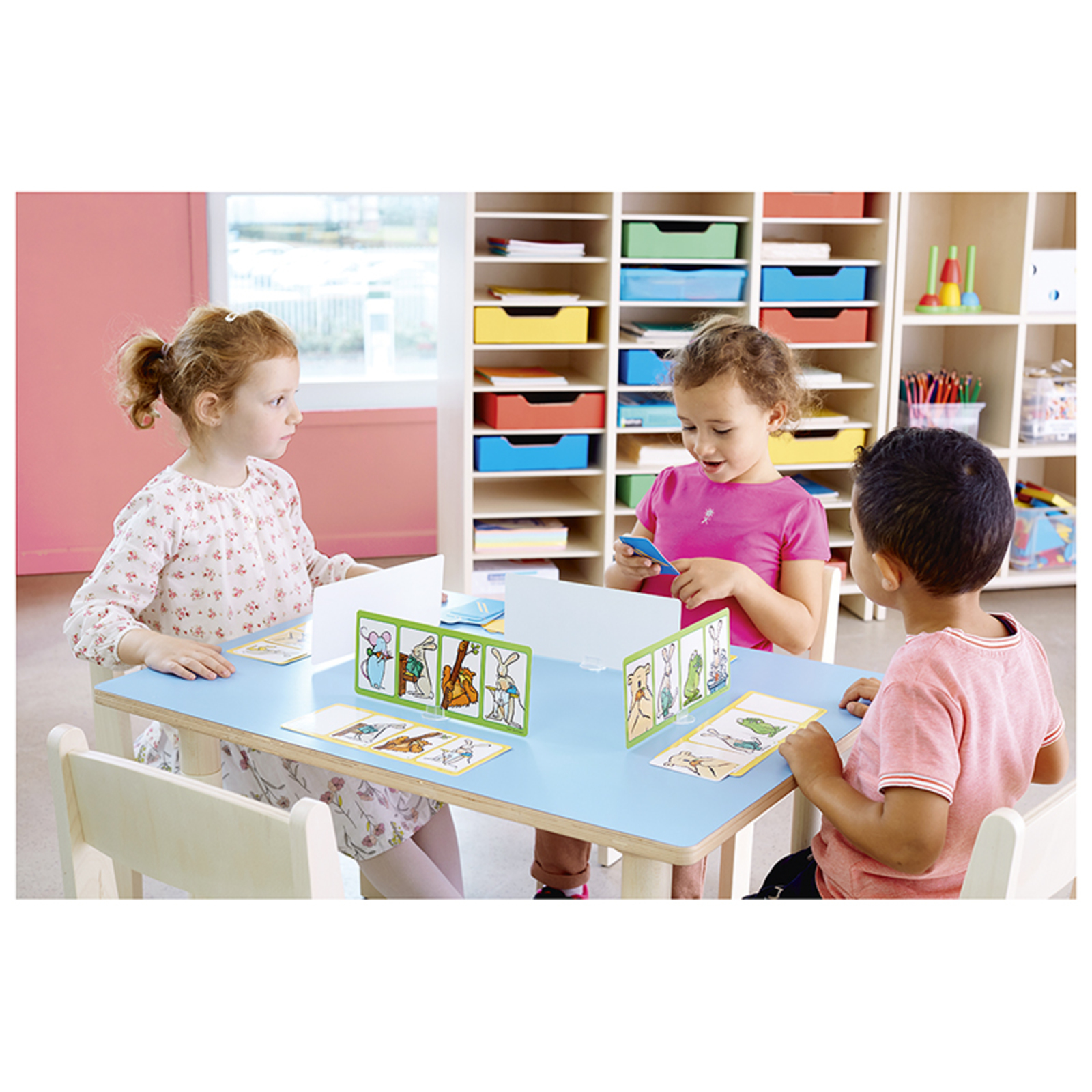 Atelier d'entraînement pour apprendre aux enfants à construire des phrases et à communiquer entre eux. Les enfants peuvent jouer en autonomie. Compétences développées : observer et repérer des indices sur une image. Savoir décrire et identifier une image. Apprendre à s'exprimer par des phrases simples et structurées. Comprendre et respecter une règle de jeu.Contenu : 4 planches supports, 12 planches modèles (3 séries de 4) avec les situations à décrire, 2 jeux de cartes identiques de 48 cartes, 8 plots transparents et 1 livret pédagogique