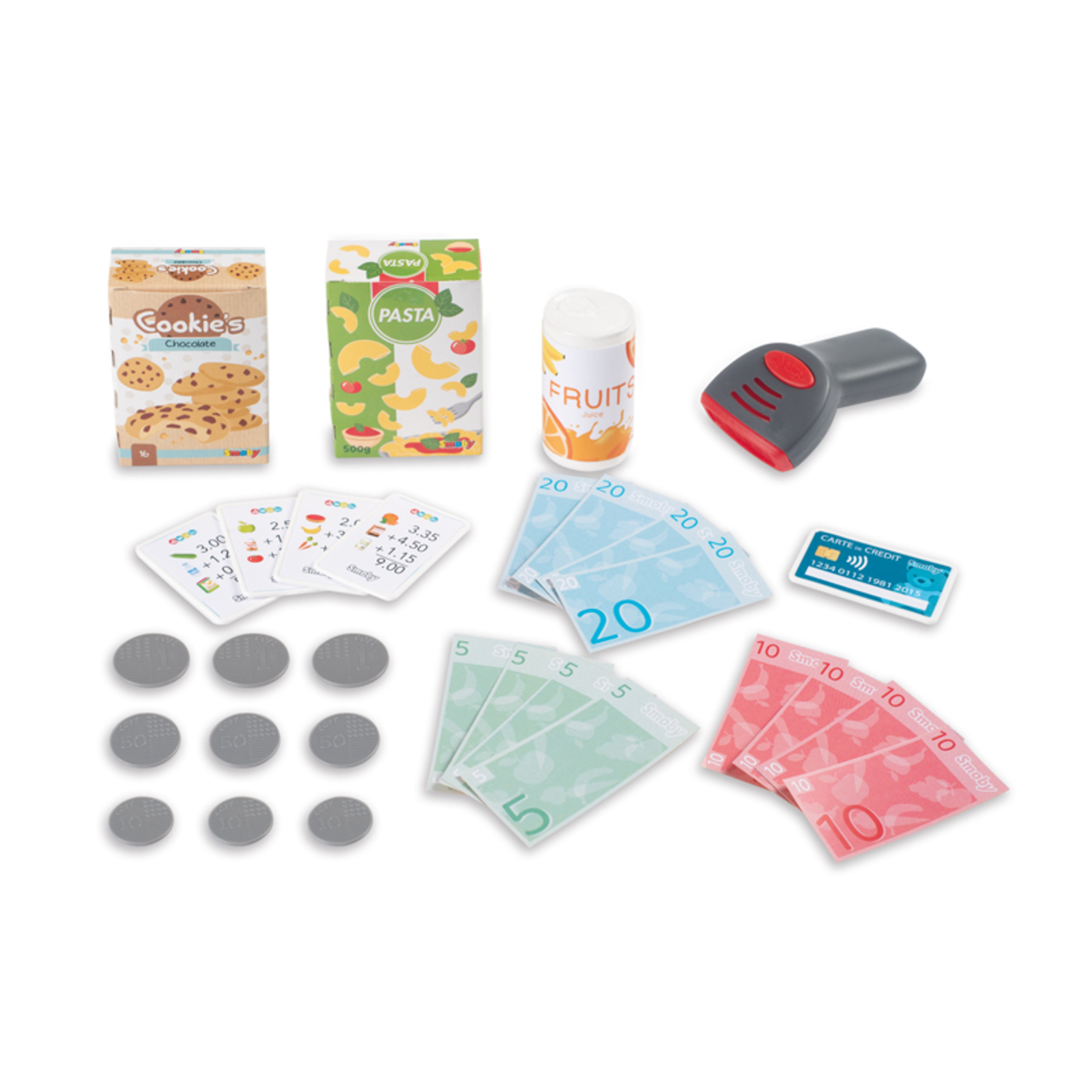 Caisse enregistreuse avec fonctions électroniques. Véritable calculatrice. Lecteur de code-barres électronique. Lecteur de CB. Balance mécanique. Tiroir caisse. 30 accessoires.Dim. (L x l x H) : 39 x 21,5 x 16 cm