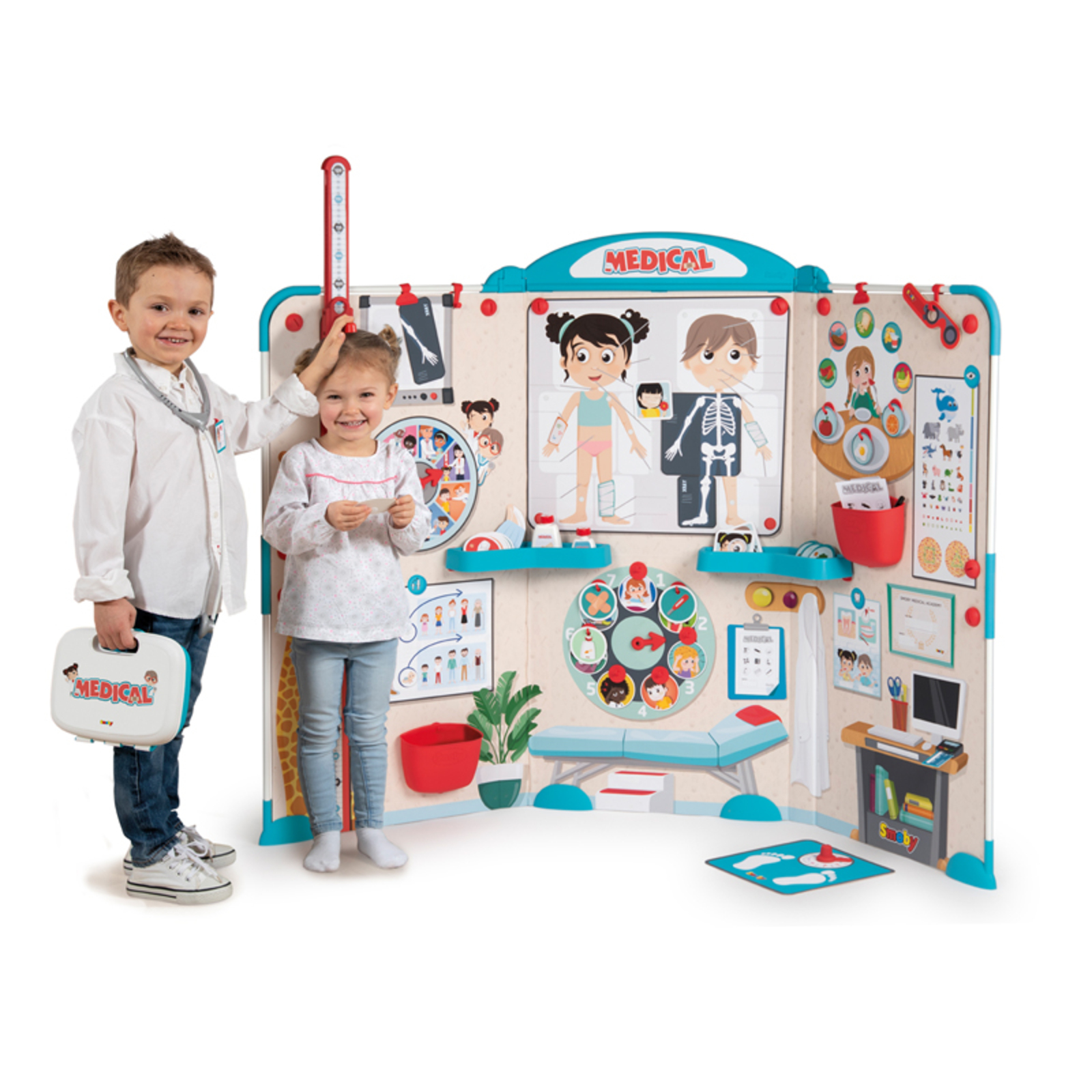 Avec le cabinet médical les enfants peuvent jouer au docteur et se familiariser avec les gestes médicaux ! Cela leur permettra de dédramatiser les rendez-vous chez le médecin. La base du jeu est un triptyque décoré possédant des tubes en métal et 4 pieds. Ces tablettes renforcent la solidité du jeu une fois ouvert. Livré avec une soixantaine d'accessoires.Dim. (L x l x H) : 135 x 41 x 120 cm
