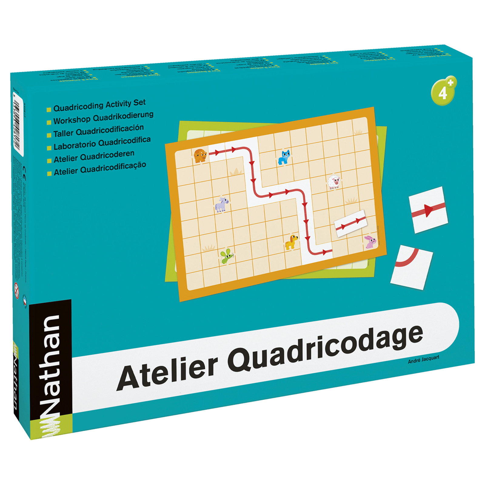 L’organisation de l’atelier est très souple et pratique : les enfants, munis chacun d’une planche et de 23 pièces magnétiques facilement différentiables par leur couleur, peuvent travailler ensemble sur l’une des 24 fiches d’activités. Les parcours à réaliser correspondent à des niveaux de difficulté différents. Mis en situation de recherche, les élèves développent des stratégies de résolution de problèmes.PROGRESSION DES ACTIVITÉSLes 24 fiches d’activités sont organisées en 4 séries de 6 fiches de difficulté progressive. Dans chaque série, 3 fiches permettent de travailler avec le recto de la planche (les animaux sauvages) et 3 fiches avec le verso (les animaux familiers).Série rond : le parcours est représenté ; le choix des pièces est libre.Série carré : les points de départ, d’arrivée et les types de pièces sont donnés ; aucune quantité n’est imposée.Série triangle : les points de départ, d’arrivée et les types de pièces sont donnés ; certaines quantités sont imposées.Série étoile : les points de départ, d’arrivée et les types de pièces sont donnés ; toutes les quantités sont imposées.COMPÉTENCES DÉVELOPPÉESSe repérer et s’orienter sur un quadrillage.Se déplacer sur un quadrillage, d’un point de départ à un point d’arrivée donnés.Repérer l’orientation d’une pièce.Repérer des longueurs (nombre de cases). La boîte contient :24 fiches d’activités (15 x 10 cm).4 planches magnétiques recto verso (32,5 x 22,5 cm).92 pièces magnétiques (46 pièces rouges et 46 pièces violettes).1 livret pédagogique.