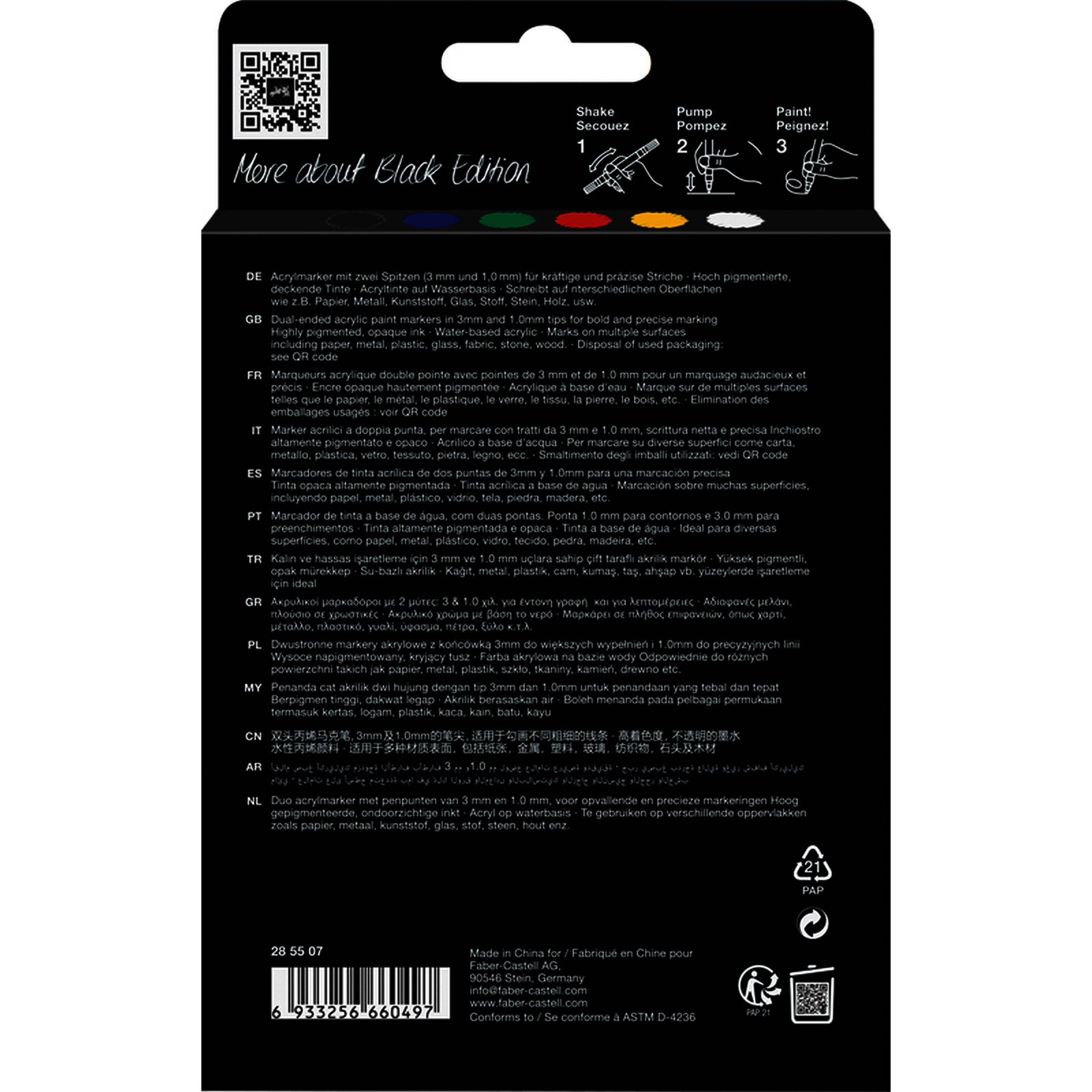 Les marqueurs acryliques Faber-Castell Black Edition sont des outils polyvalents avec une double pointe (1 mm et 3 mm) pour des d?tails fins et des aplats. Ils offrent une opacit? et une intensit? exceptionnelles sur divers supports comme le papier, le m?tal, le plastique et plus encore.