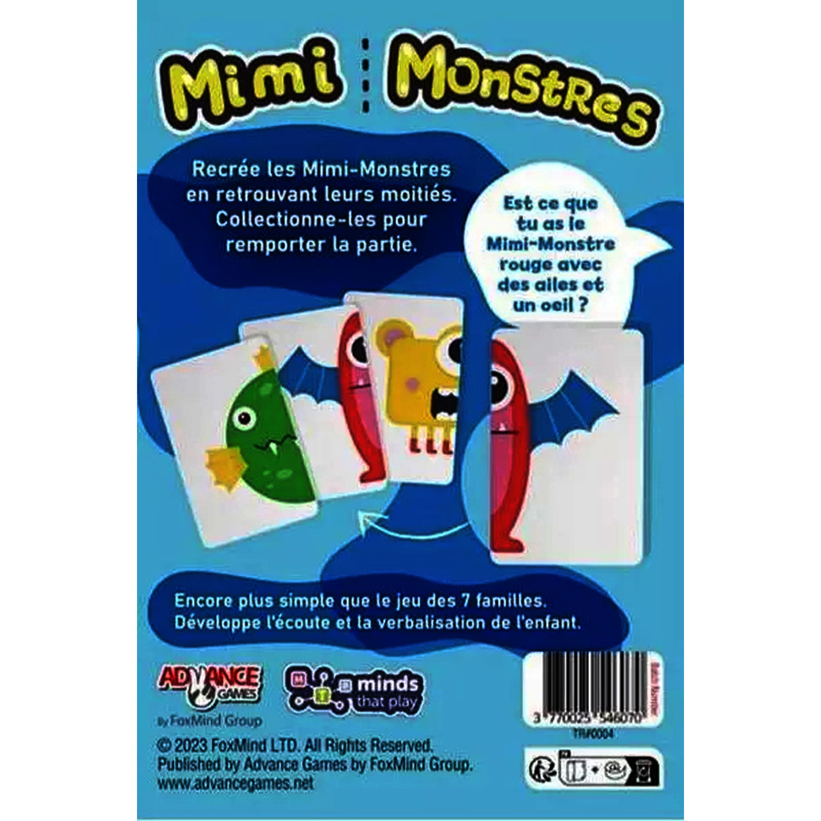 But du jeu : vous devrez formez des paires. Choisissez un Mimi-Monstre de votre main et d?crivez le en citant 3 ?l?ments au joueur de votre choix. Si le joueur d?tient la carte, il vous la donne pour compl?ter la premier moiti? de votre Mimi-Monstre.